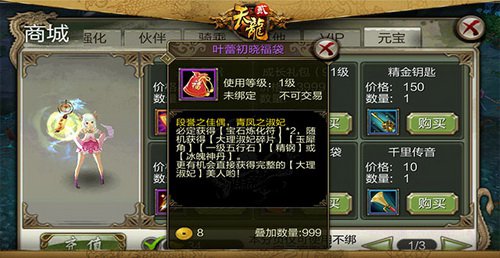 想一睹大理淑妃的姿色,就快去天龙江湖中寻找吧。所谓:爱美之心,人皆有之。翻开【叶蕾初晓】福袋就有机会取得随机数量的大理淑妃佳人碎片,更能直接取得完好的大理淑妃佳人!