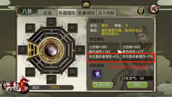 八卦首要分為卦位和卦象兩部分。在【八卦】→【卦盤強化】分頁能夠看到卦位,強化卦位能取得特點和战力的提高,卦位強化到必定等級時分,也能提高本位置的卦象特點。      八卦盤中總共有八個卦位,強化每個卦位時也會提高卦位對應的根底特點和佩帶在本卦位卦象的特點。間單來說就是:卦位強化等級越高,卦位根底特點加的越多,佩帶卦象後卦象的特點越高。