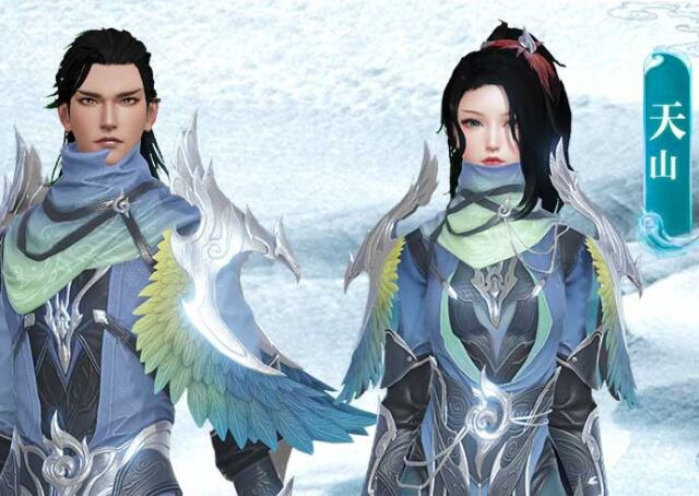 男款時裝盡顯幹練與挺立,腿部戰甲規劃極具包裹感,仿佛遁身於夜色,隨時都會爆發出逾越常人的速度與力量。雙肩靈鷲徽記分外引人矚目。      好像與刺客習氣的低調不符,而這恰恰展現出對天山武學的理解與自傲。衣領處紗巾蒙面,銀飾在月色下映射出駭人的光芒,危險已經悄然臨近。      一席勁裝盡顯身段之曼妙,戰甲與輕紗結合,銀鉤與鳥羽相襯,仿佛下一秒就要融入濃濃的夜色之中。女款時裝的規劃輕巧低調,靈鷲徽記也愈加貼合身體曲線,周身以銀飾裝點,舉手投足間散發著特別的優雅,無論是隱遁無形又或驟然突擊都絲毫不拖泥帶水。      作為夜色中綻放的寒芒,以精湛的身法與淩厲的進攻化作敵人恐懼的夢魘。蟄伏西域數十載,也是時分與中原各派一較鋒芒!當即預約《天龍八部2》手遊,感觸縹緲靈鷲的赫赫威名!