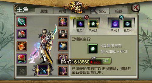 暗器的宝石分为进犯与防护两种类型。进犯类宝石包含:内功、外功、穿透、暴击、命中、暴伤加成、法力;防护类宝石包含:内防、外防、耐性、暴抗。